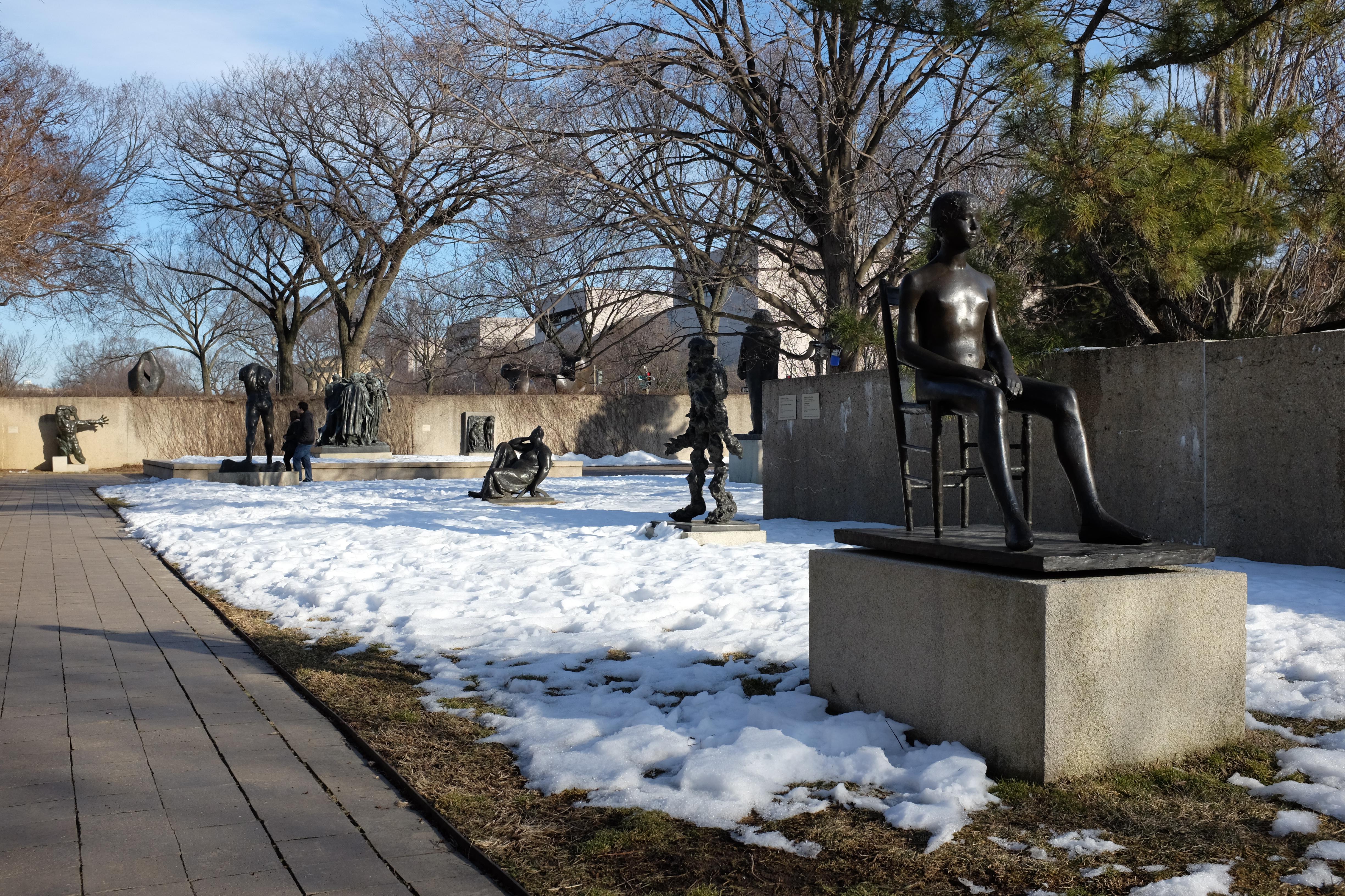 The Hirschhorn Museum and Sculpture Garden is an interesting place in that it plucks you out of your comfort zone, and places you squarely upon the lap of the absurdly avant grade, otherwise known as Contemporary and Modern Art. Nothing wrong with that you might think, for an establishment such as this. Cylindrical in nature, hovering above the ground just off of the Mall in Washington DC like a space-craft from a 1950s B movie, replete with garden sculptures of huge killer bacon rashers, and odd-bods parked upon chairs in the nude – good thing they don’t feel the cold is all I can say, otherwise we might have had more of a display of artistic expression than our frozen eyeballs were prepared for!