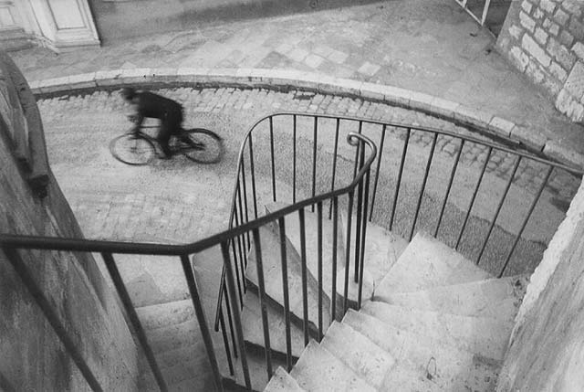 Henri Cartier-Bresson / Magnum Photos. This is a case of seeing the pleasing geometry of the staircase, which roughly equates to the Golden Ratio via the negative space it creates, and waiting for someone to pass through the Phi point the cyclist is in.