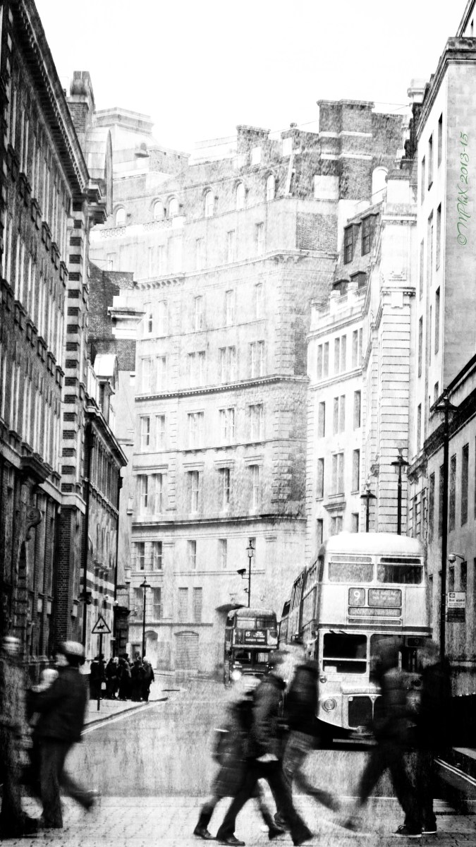 Despite being captured in 2013, this London street scene has been enhanced so that it looks like an old faded lithograph. The style of the old fashioned double decker busses adds to the ambiguity of the age of the image, as does the lack of definition of the people crossing the street, as well as the lack of focal sharpness of the overall shot. The image sharpness and quality of the shot, including the ambiguity of the age of the shot adds to its artfulness, despite being a straightforward representation of a real and modern street scene.