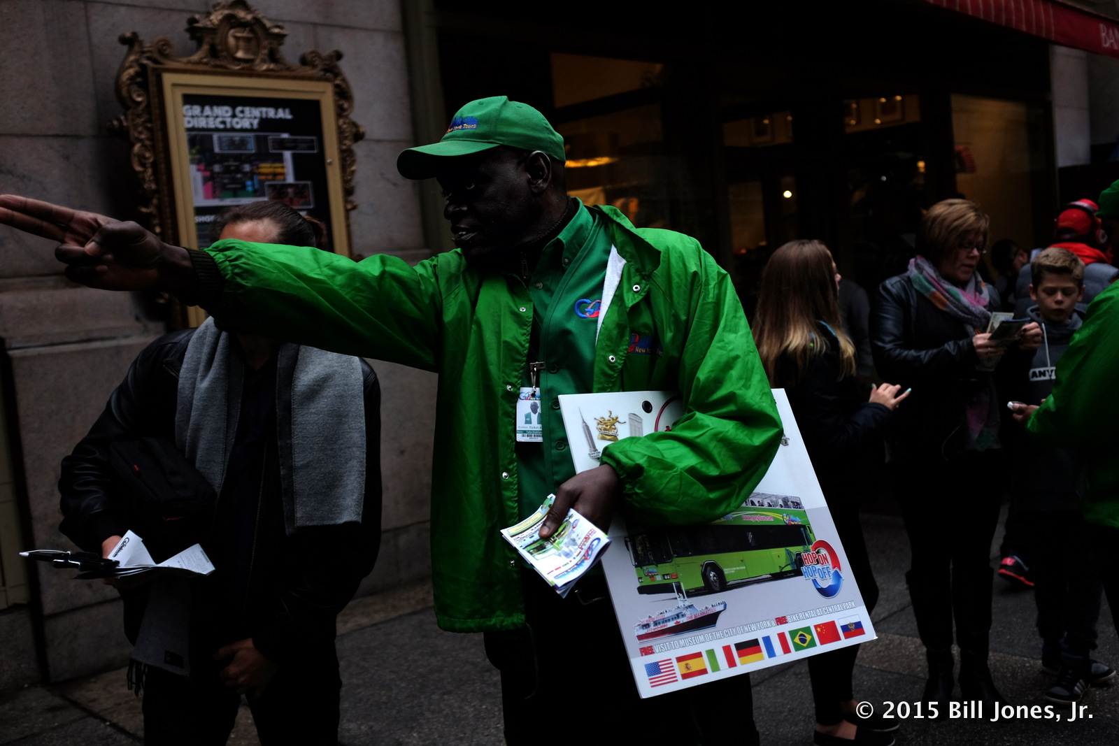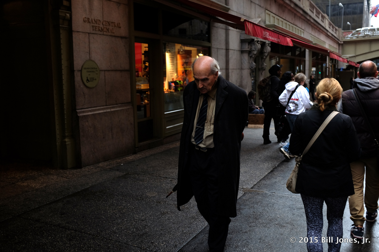 In these two shots, taken at the same place — New York’s Grand Central Terminal — and at the same time, under similar conditions, my jpegs (below) came out somewhat underexposed. In part, that was on purpose. I wanted the rich color tones underexposing produced, and I knew I could fix the darkness in post-production. But some of it was accidental. As I shot up and down the street, the light changed, and people passed by too quickly for me to make all the needed adjustments. That’s a fact of life in street photography. You get a second, maybe three. Period.