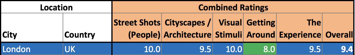 So, what is the overall rating based on, you might ask? The answer is simple: the richness of the opportunity for good photography. Street photography isn’t just about people. Similarly, photography trips aren’t just about snapping photos. Therefore our ratings encompass a number of aspects of street photography and maneuvering in the city: People Shots, Cityscapes, other Visual Stimuli, Getting Around, and the Experience as a whole. These are detailed more below.