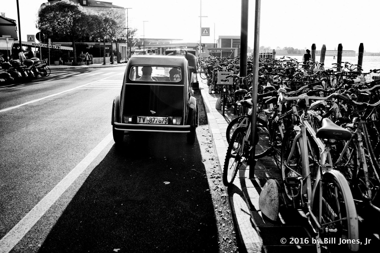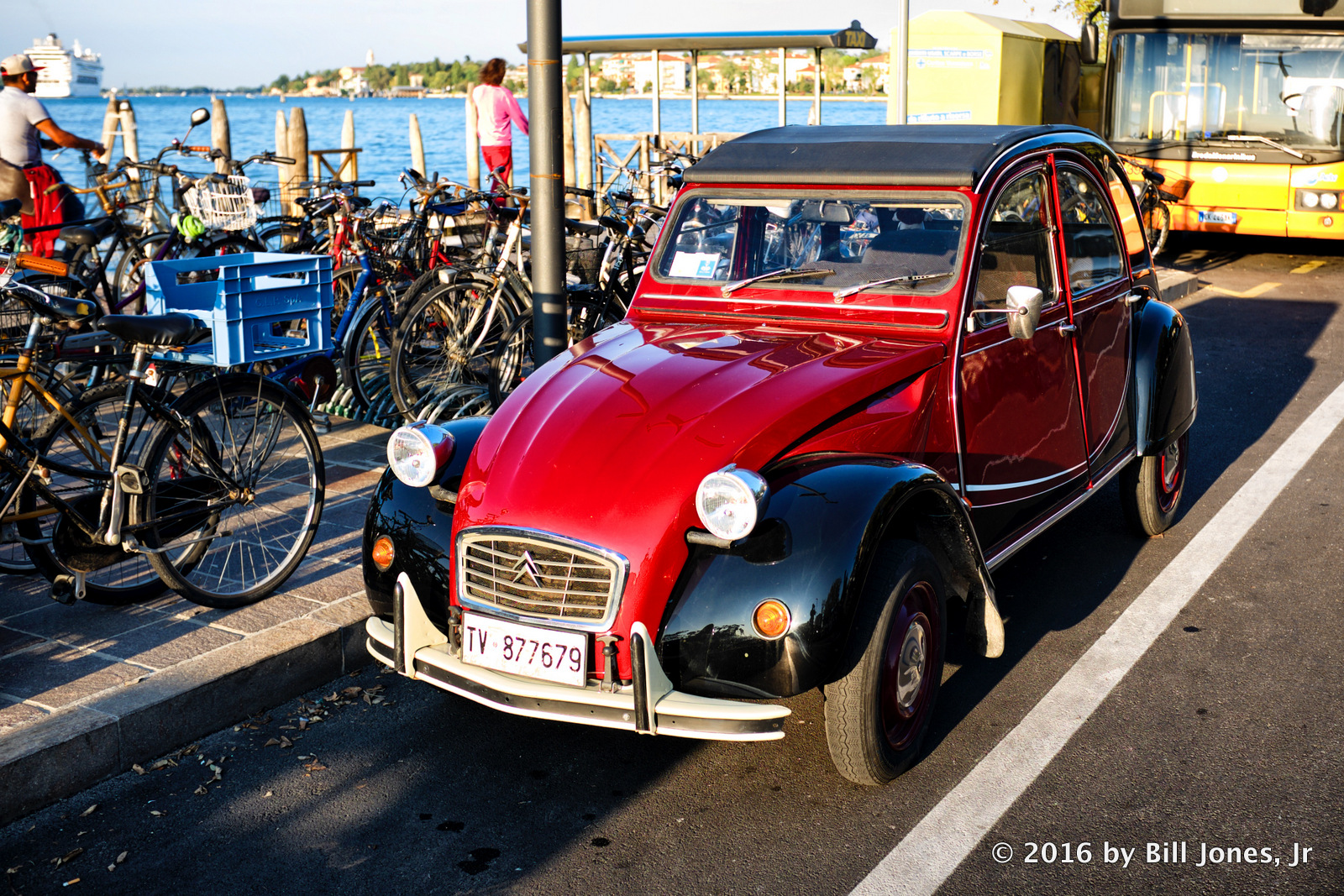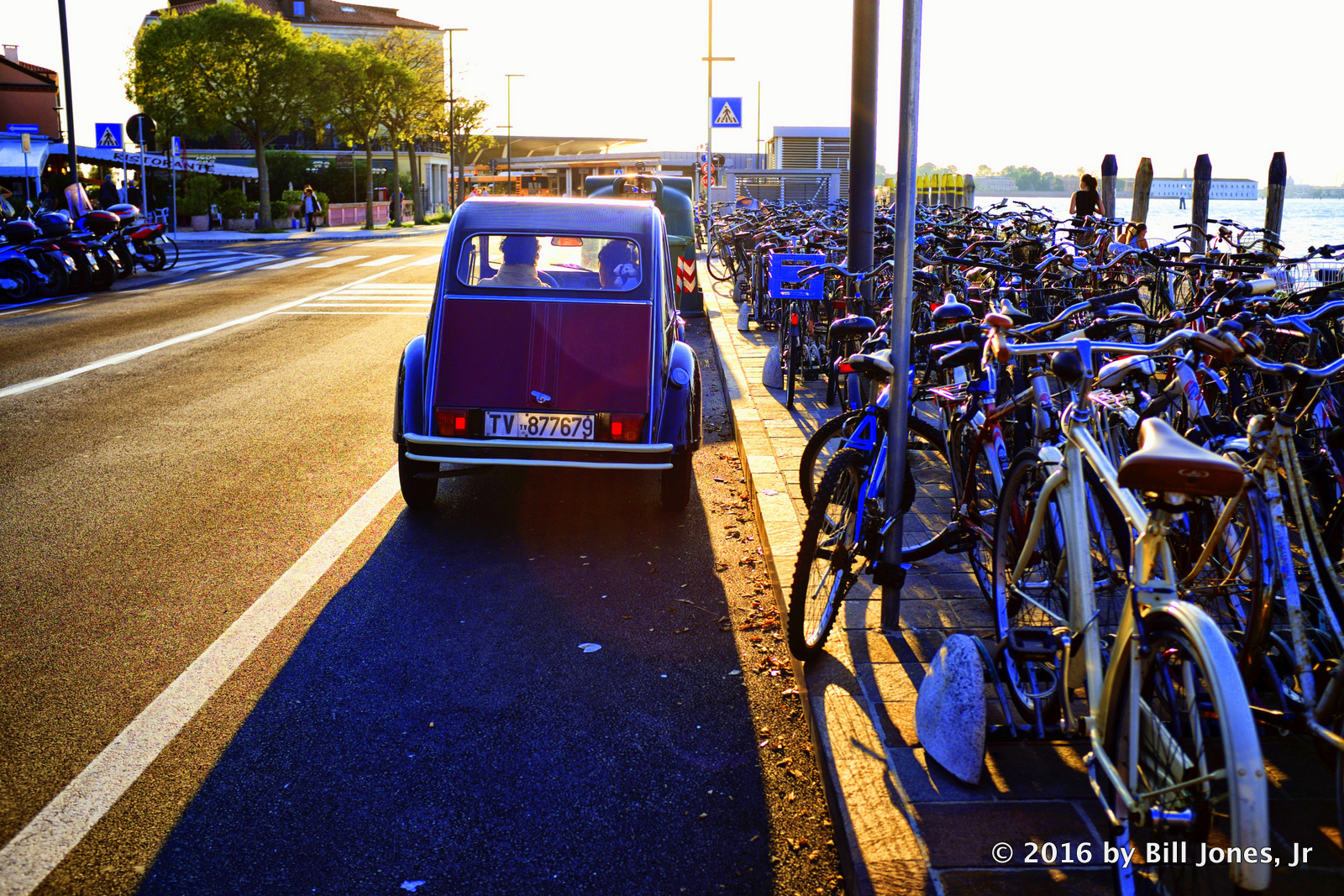 This is a simple shot of two people sitting in an old Citroën in Lido, Venice, Italy in late September 2016. It’s approaching sunset, the sky is filled with long wavelength light (reds and orange) as can be seen reflected in the pavement. However, widely scattered short wave blue and purple light still exist in abundance, largely because they are more efficiently by our Earth’s atmosphere. We see them as blue and not purple, because our eyes more easily detect blue light, and because the sun gives off slightly more blue than purple light waves. However, what is important is that these light waves exist in abundance whether you can detect them with your eyes or not.