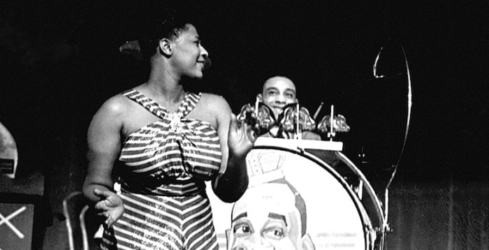 Ella never talked about these times, and never let them get her down. After running away, in November 1934 she appeared on stage for the first time at the Apollo Theater’s Amateur Night. She had intended to dance, but became intimidated by another act and chose to sing instead, performing in the style of her idol, Connee Boswell. Ella won first prize. Some two months later, she was singing for a week with Tiny Bradshaw at the Harlem Opera House, where she was introduced to Chick Webb, the drummer/bandleader who was raging hot at the time. Chick wasn’t interested at first, wanting a girl who had that certain look, but Ella had the sound, and Chick was hooked. Ella played with Chick’s band at the Savoy, enjoying fame until Chick died in 1939 of tuberculosis. Between when she began with the group and 1942 when she ended her run as the band’s leader, she’d recorded 150 songs, launched by her hit record, “A-Tisket, A-Tasket.”