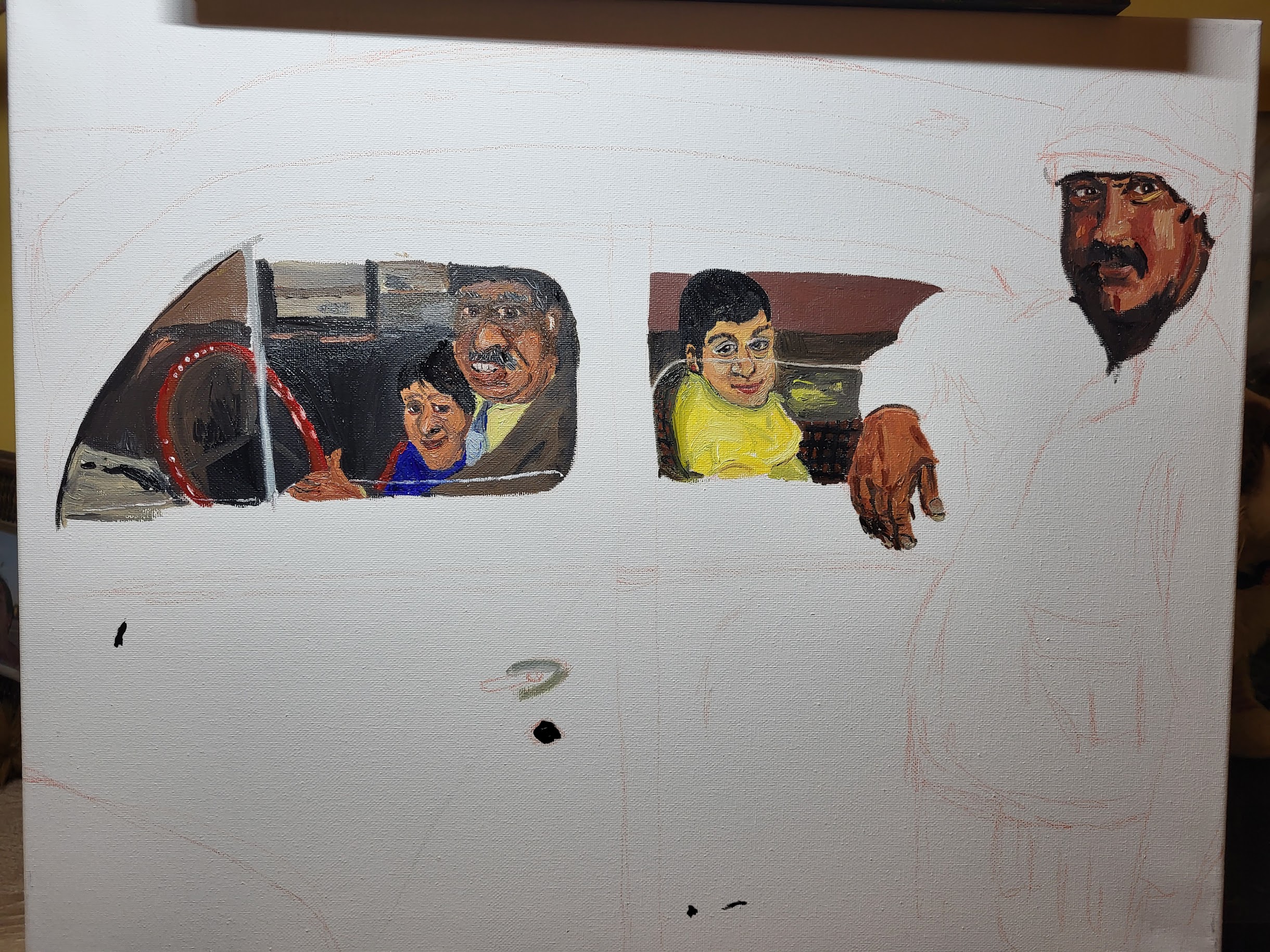 I am not a trained artist. I am a photographer and a novelist. Painting is a retirement hobby. I do have, however, an artist “wife coach.” Seeing her paintings develop and seeing mine are two different experiences. Maria’s paintings bloom like flowers in early June. You can tell from the start they’ll be lovely, you just can’t see past the buds initially. My paintings are cocoons. You hope they’ll evolve past the chrysalis stage and form a butterfly, but often, they turn out to be moths or the odd cicada. Fortunately, my wife loves all my bugs. This one I decided to paint without a formal drawing or my usual prep. It’s called “Syria, 1995,” after a Harry Gruyaert photo. Let’s see what sort of insect we make.