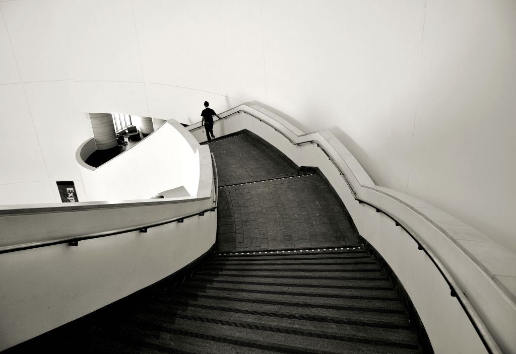 These two shots were taken on the main staircase at the National Museum of the American Indian in Washington, D.C. (2009). Both focus on the structure of the stairs, but in the color photo, the people stand out more and become a more important part of the composition. In the bw shot, even though there is a human, they have been reduced to a silhouette by the monochrome treatment.