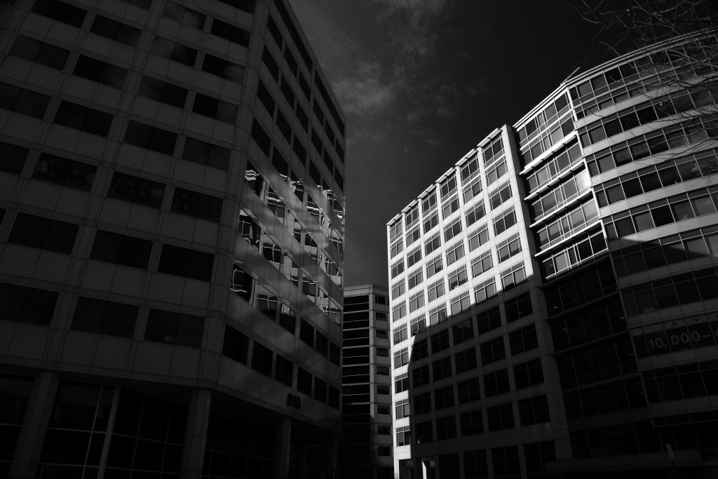 Again, two highly structural compositions of buildings near Union Station in D.C. (2013). In the color photo, I care about the blue sky and want to emphasize its reflections in the building window. The colors are harmonious and don’t attract your attention beyond where I want you to look. In the bw shot, I don’t care about the sky. This is photo about light, shadow, and rectangles. Full stop.