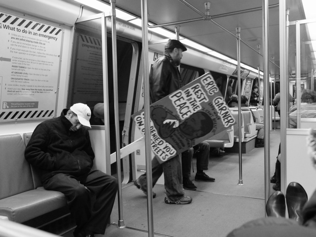 The final two photos show how color changes the story of humans in their environment. In the Bicycle Fix (2016) photo, we are drawn to the woman and her warm tones, standing like an island amongst the cooler ones. Her friend fixes her bike, but he’s cool too, so we don’t care about him. In the distance, the warm building at the left and the brightly hued people to the right promise there is warmth to be had when her friend finishes. In the other photo, again on the D.C. Metro (2013), a man enters the train with a sign protesting the killing of an unarmed man named Eric Garner. I was shooting in native black and white, so when he entered the train, the arms-length monochrome focuses your attention the sign and not its bearer. Humans are alive in black and white, but they aren’t our humans. They are strangers, others.