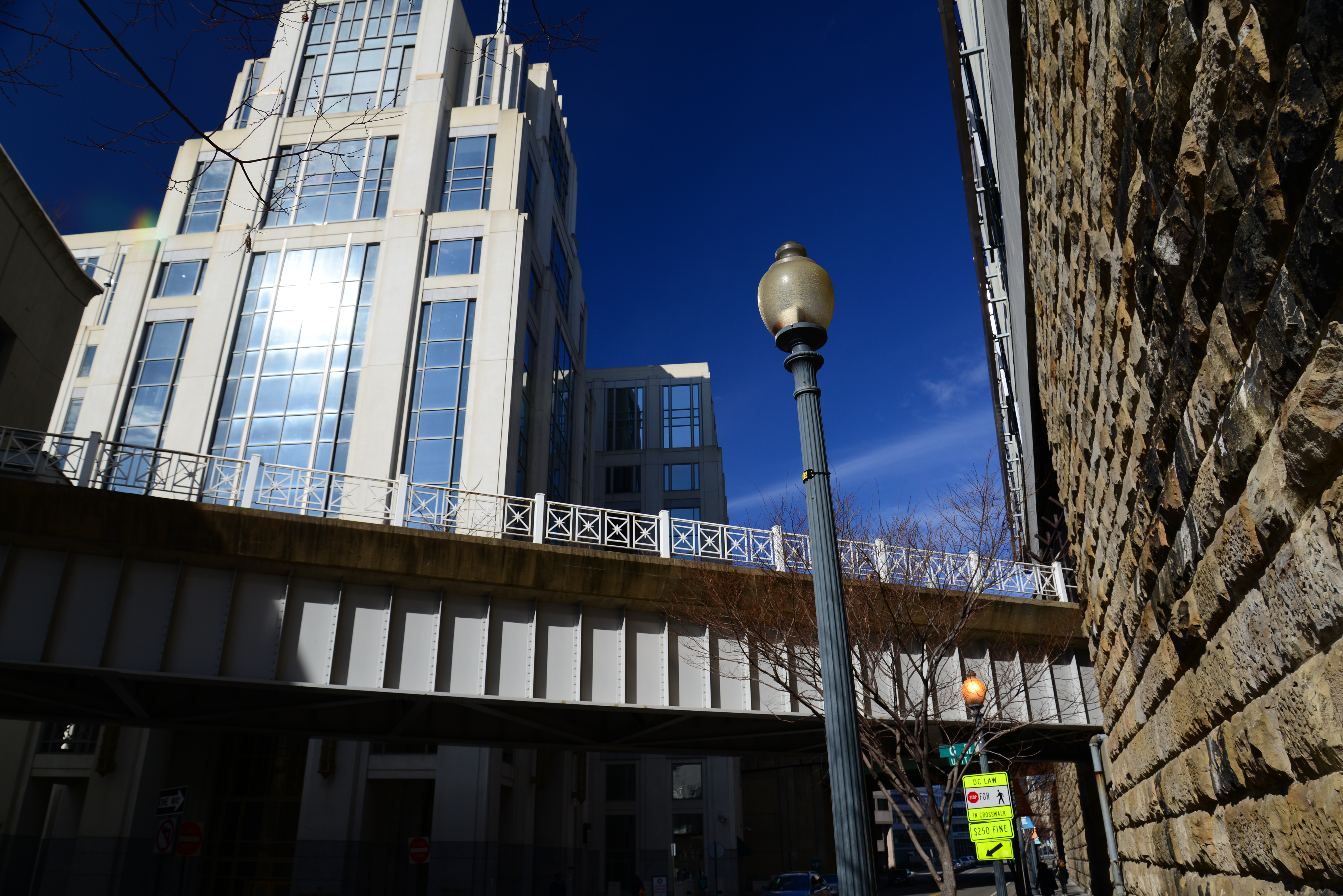 Again, two highly structural compositions of buildings near Union Station in D.C. (2013). In the color photo, I care about the blue sky and want to emphasize its reflections in the building window. The colors are harmonious and don’t attract your attention beyond where I want you to look. In the bw shot, I don’t care about the sky. This is photo about light, shadow, and rectangles. Full stop.