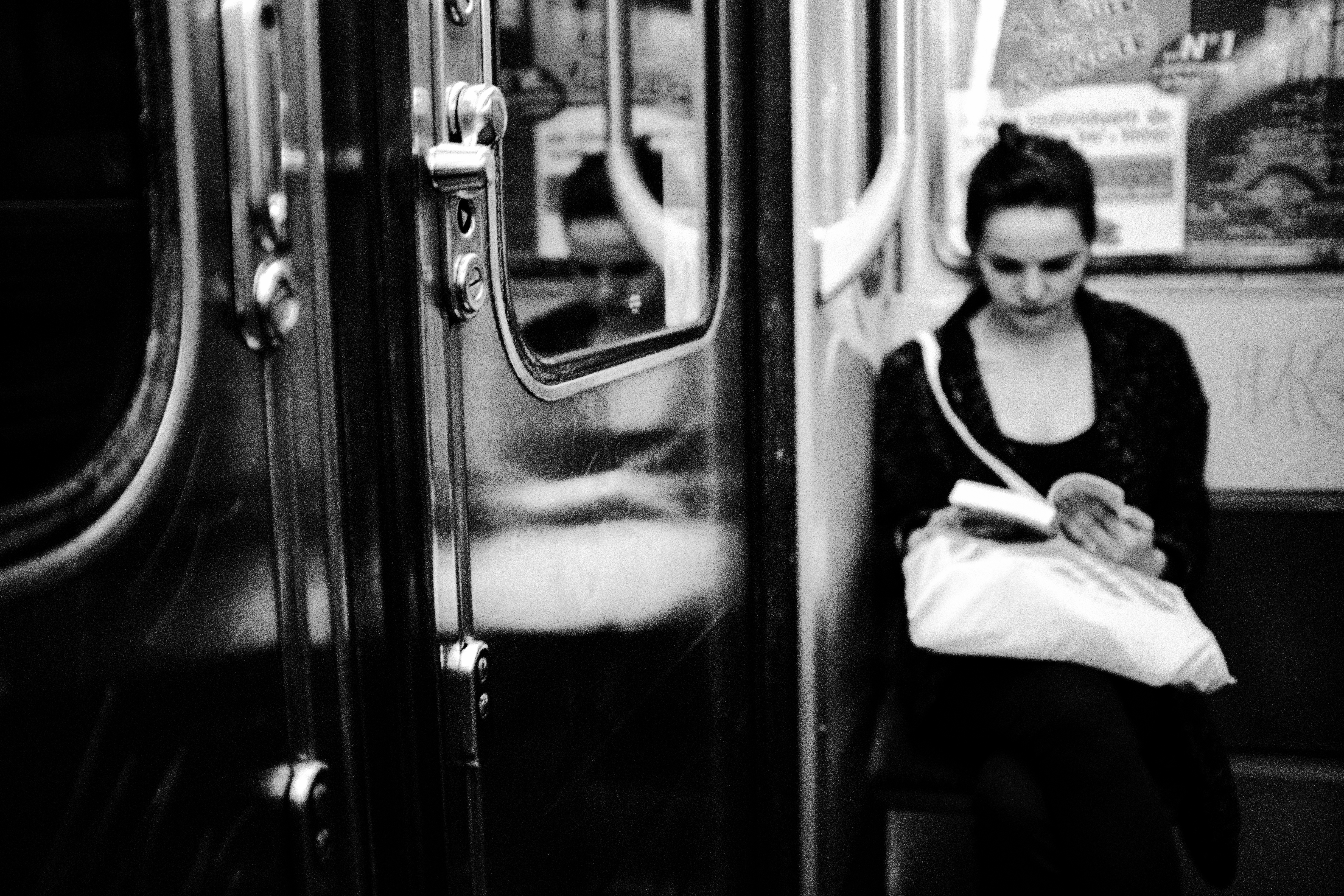 Like the DC Metro Shot, the above photo of the woman reading on the Paris Metro (2015) focuses on structure and story rather than the woman as a person. She is a reader, presented to the viewer as merely as a figure taking an action, rather than as a person with a story to present. We only know what she is doing and the arms-length feel of the bw keeps it that way. Instead, we focus on the metro car’s door and its gleaming metal. Structure is for black and white. Color for bringing that structure to life.