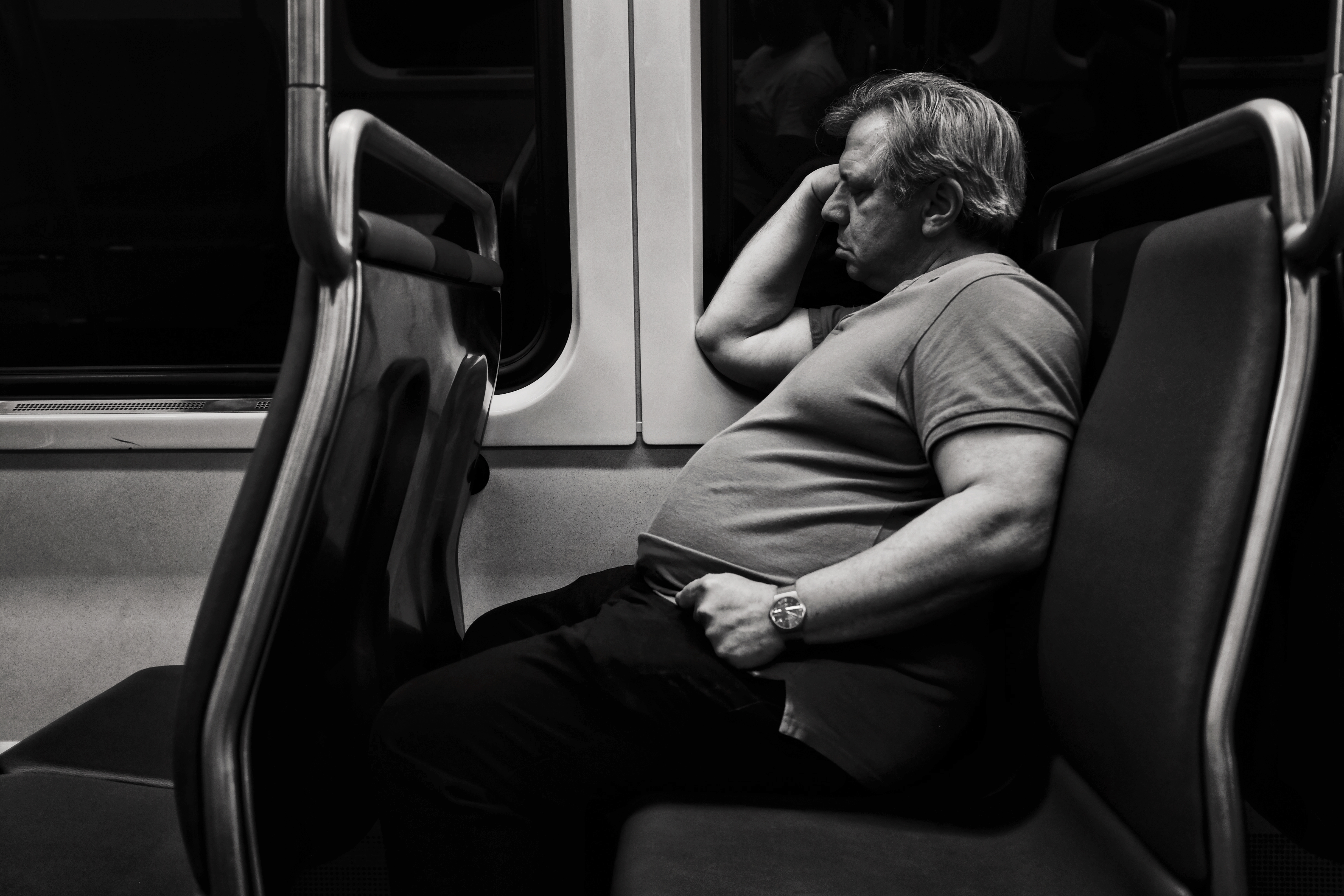 In the black and white version, we lose the connection to his humanity because he’s no longer a warm hue. His skin is cool gray. He isn’t completely dehumanized, but we are a bit detached from him. Now we focus more on the structure of the train car, on the seat, the folds in his clothes, the shadows on his skin. I emphasized that structure and the detachment by increasing the contrast. Now his slumber isn’t as peaceful. Somehow, with his eyes hidden in shadow, his sleep is pitched with drama. I could have increased the contrast on the color image, but drama is easier to achieve when you remove non-essential color as an element.