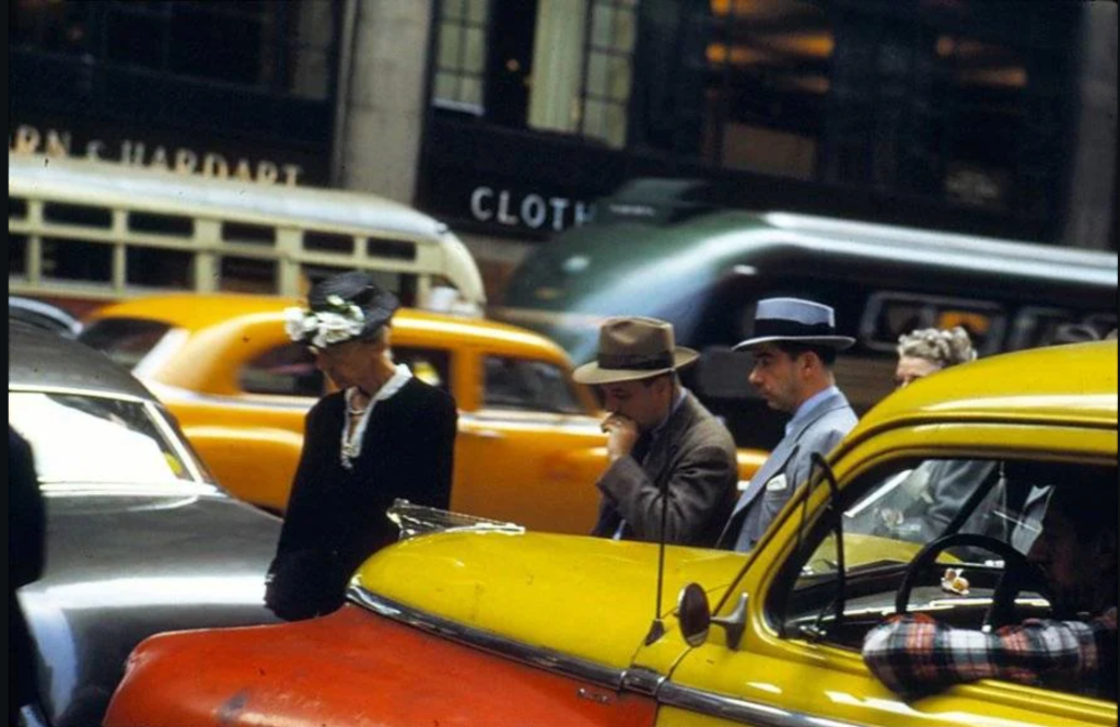 In NYC, Ernst Haas frequented the streets, often capturing the city’s taxis’ brilliant red, yellow, and green hues.