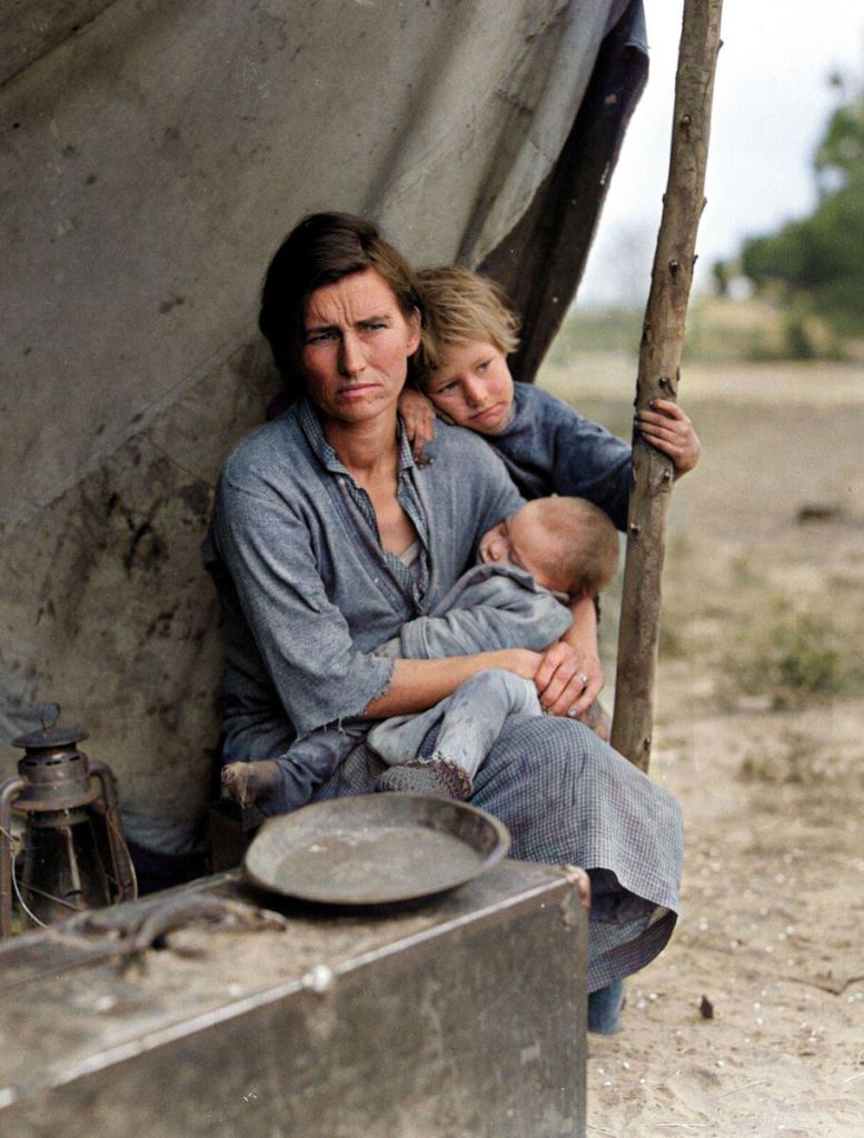 The FSA captioned the photo, “Destitute pea pickers in California. Mother of seven children. Age thirty-two Nipomo, California,” and gave Lange credit for her work even though as a work-for-hire for the U.S. government, it was entirely within the public domain. Despite the “Migrant Mother’s” having been promised that the photo and her name would never be sold, Lange released it to the FSA who listed the woman as Florence Thompson, heralding her as representing the plight of similarly poor, white Americans suffering during the Depression. Florence, was, in fact, not a migrant worker, in the traditional sense, nor was she “white,” according to the narrow definition of the time.